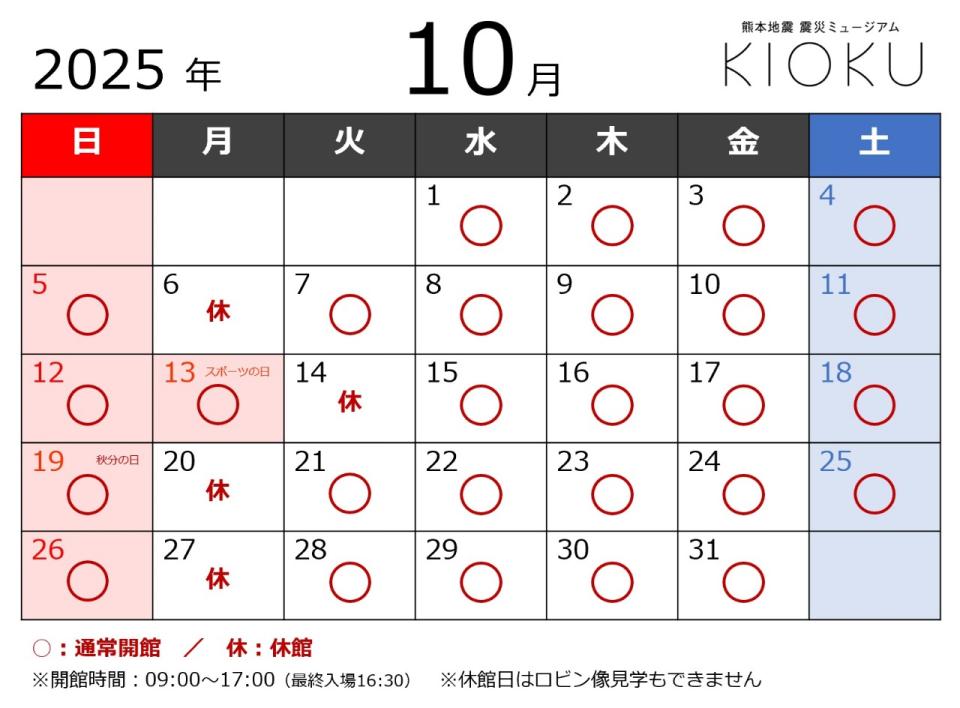 2025年09月22日 お知らせ 【2025年10月】開館日カレンダー ※祝日にご注意ください 2025年10月の熊本地震震災ミュージアムKIOKUの開館日のお知らせです。 月曜休館(祝日の場合は翌平日が休館)となっております。月曜祝日があるため、休館日にご注意ください。 ・10月13日(月・祝):開館日 → 10月14日(火):休館日 ※休館日はロビン像見学もできません。