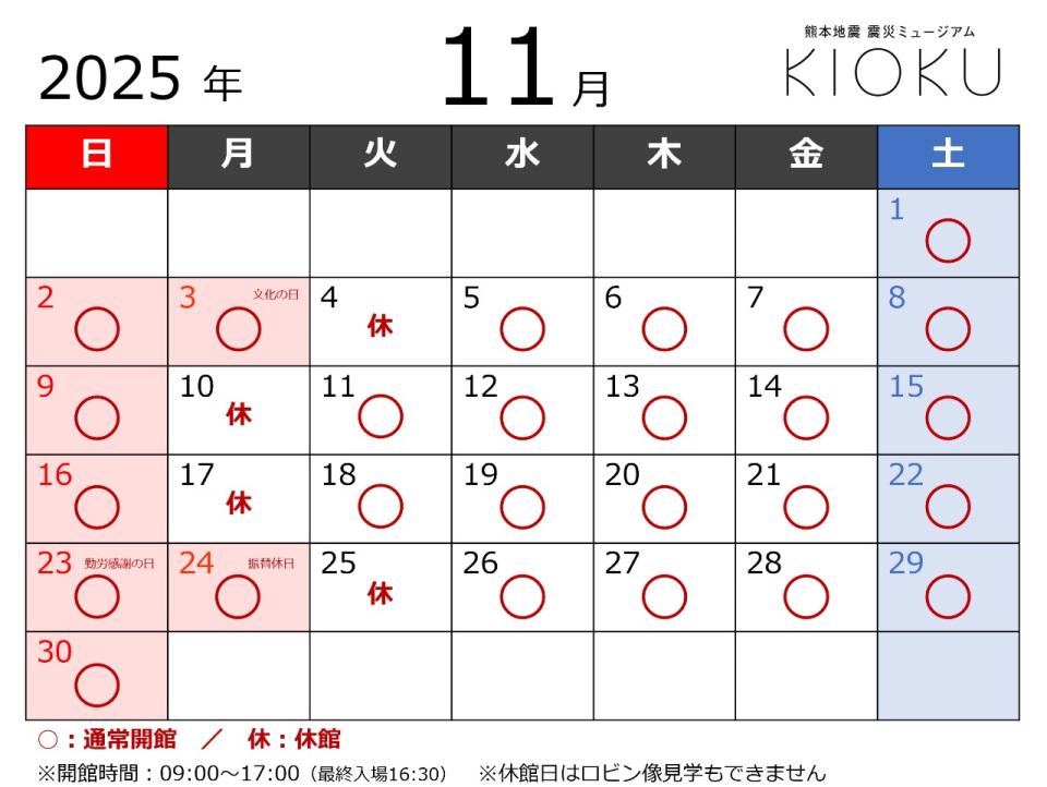 2025年10月25日 お知らせ NEW 【2025年11月】開館日カレンダー ※祝日にご注意ください 2025年11月の熊本地震震災ミュージアムKIOKUの開館日のお知らせです。 月曜休館(祝日の場合は翌平日が休館)となっております。月曜祝日があるため、休館日にご注意ください。 ・11月3日(月・祝):開館日 → 11月4日(火):休館日 ・11月24日(月・祝):開館日 → 11月25日(火):休館日 ※休館日はロビン像見学もできません。