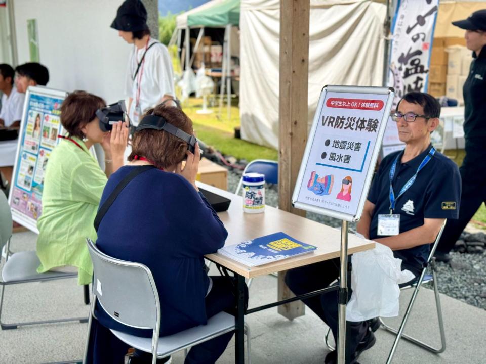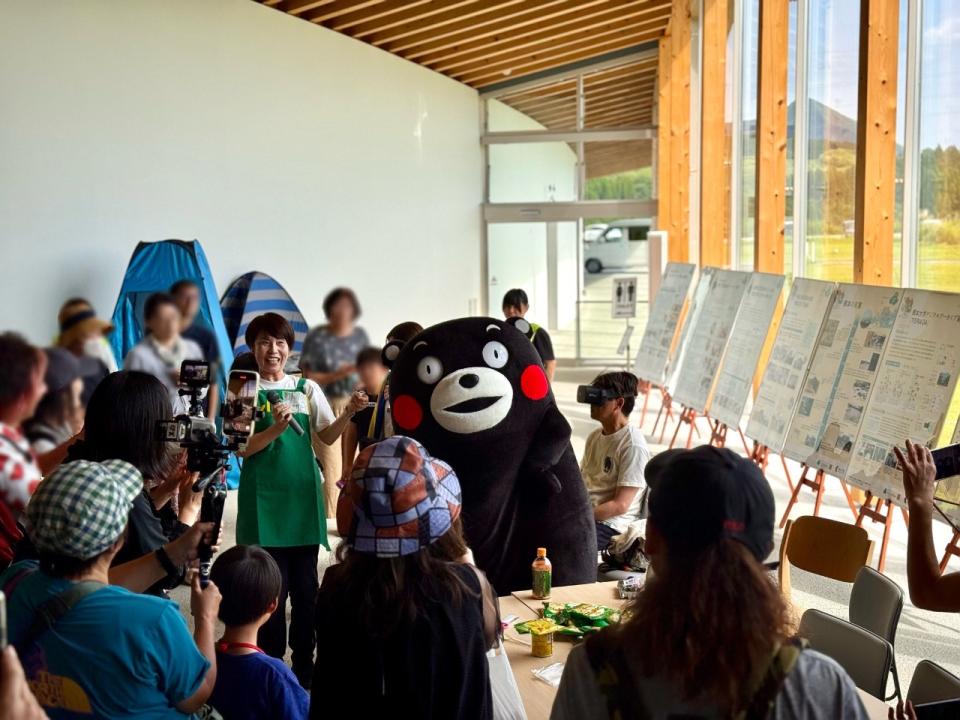 地獄温泉青風荘.の河津さん、阿蘇珈琲の後藤さん、そしてKIOKU語り部ガイドによる座談会では、熊本地震を振り返り、復興の歩みと今後の課題について語り合いました。午後には歌う防災士“しほママ”柳原志保さんの防災ワークショップが開催され、くまモンも登場して会場は大いに盛り上がりました。また、熊本県危機防災管理課によるVR防災体験があったり、阿蘇中央高校生徒がクイズラリーや縁日企画を盛り上げたりと、来場者に防災を楽しく体感していただける1日となりました。