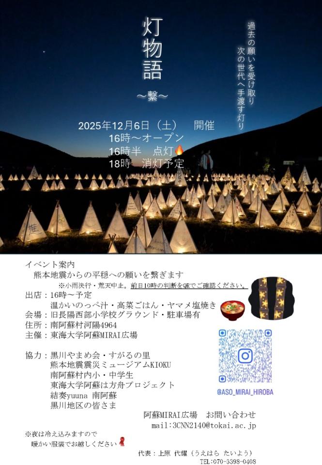 2025年12月6日(土)、現役の東海大生の学生団体「阿蘇Mirai広場」によるイベント「灯物語(あかりものがたり) ~繋~」が旧長陽西部小学校のグラウンドにて開催されました。